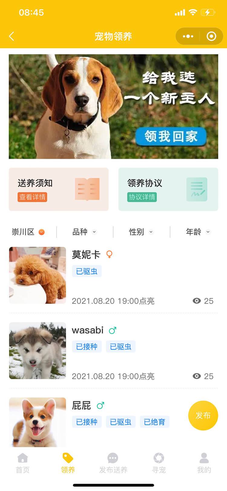 支持宠物领养、送养信息发布,包含宠物品种、年龄、性别、健康状况,支持资料审核、信息下架,实现宠物领养送养信息的规范化管理。