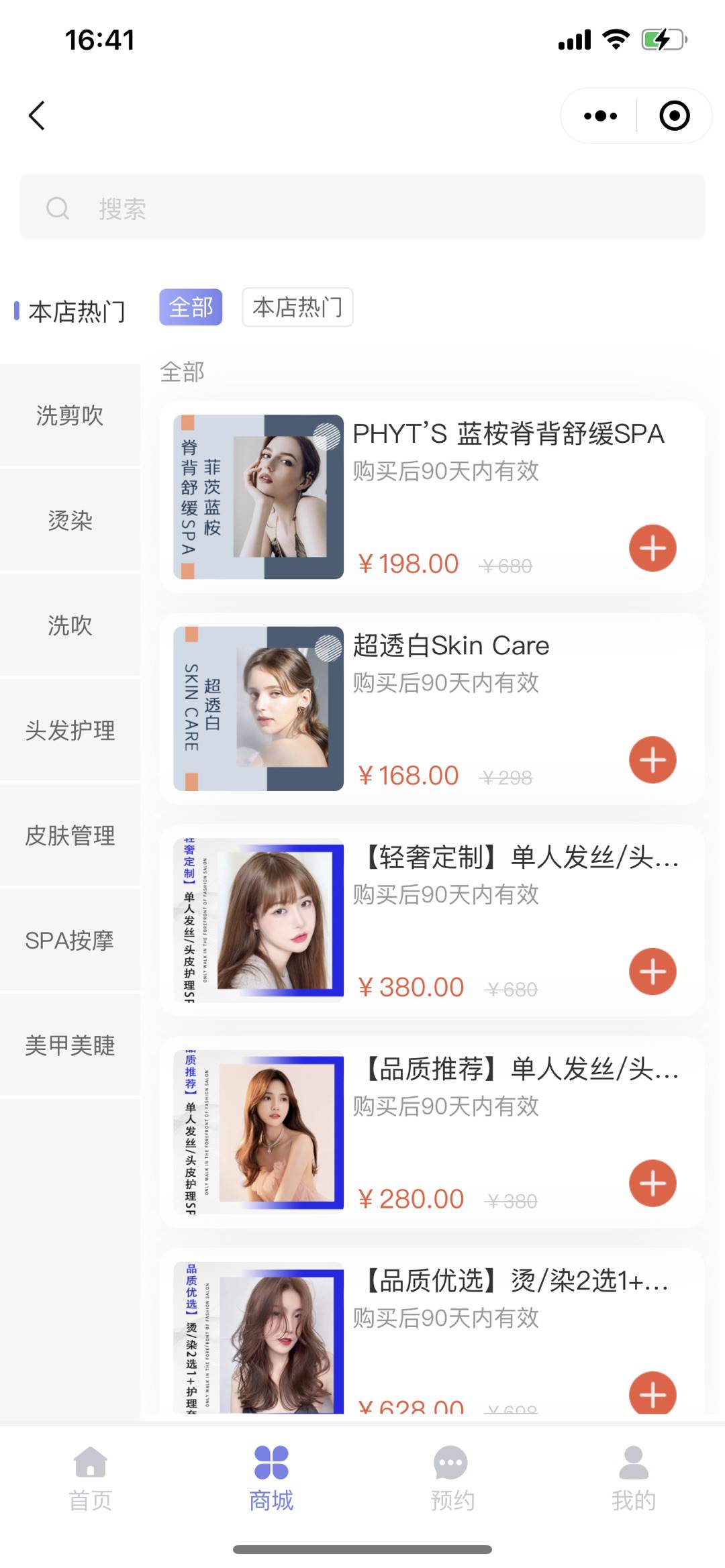 支持美容美发项目自定义配置,包含项目内容、价格、时长、适用人群,适配项目套餐、组合优惠、体验价,满足不同客户的美业服务需求。